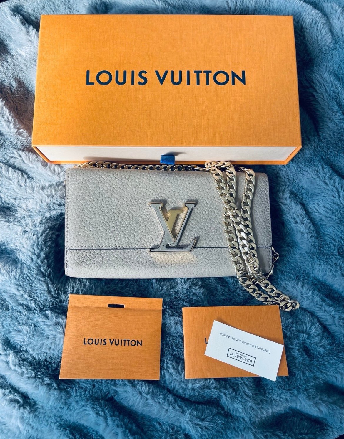 Louis Vuitton Capucines Greige Wallet on Chain in good pre owned condition. It is very roomy, fits iPhone/iPhone Max Pro, your keys and lipstick, cash and credit cards. Can be worn as a crossbody or a shoulder bag. Neutral color of grey+beige is an excellent addition to any wardrobe as it goes with everything. A beautiful designer piece.